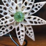 This Double Starfish Shape Ornament is a stunning example of ocean art. The ornament’s base is designed to resemble the appearance of two starfish with arms that include delicate spirals embedded within carve-outs of diminishing size as the arms radiate from the base. Carefully attached to this base, the opalescent, emerald green or mint green (your choice) glass gem completes this stunning piece. Hover over image to zoom in for a more detailed view of its beauty.
